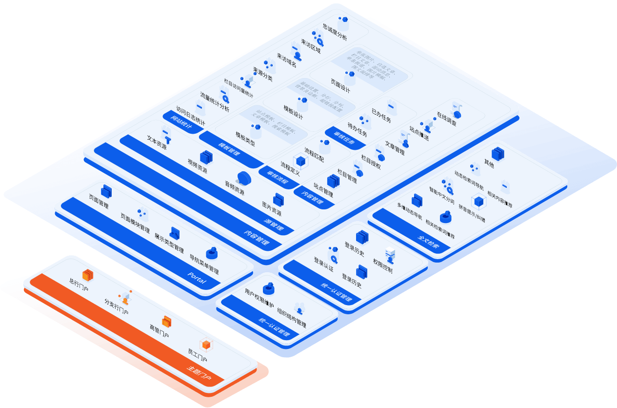 統一門戶集成平臺基于公司自研ORIGINAL平臺為底座架構,包含內容管理、統一認證管理、統一用戶中心、統一待辦、全文檢索、多網站群建設等多種功能模塊,可支持多種信創技術路線混合使用;